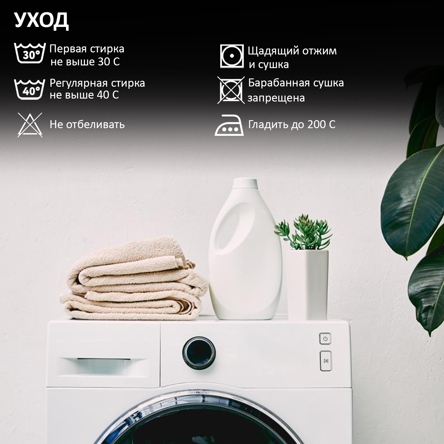 Стирка 40 градусов. Деликатный отжим 400-600 оборотов. Глажка на средних температурах. Не использовать отбеливатель. Не сушить в барабане.